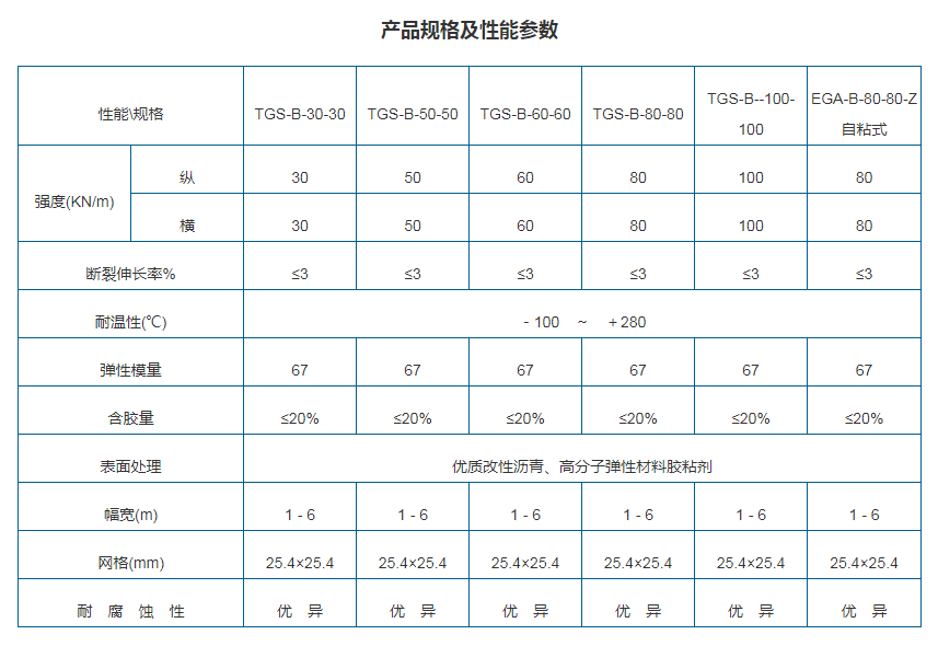 玻纤土工格栅-玻纤土工格栅是一种用于路面增强、老路补强,加固路基及软土基的优良土工合成材料。玻纤土工格栅高强无碱玻璃纤维通过国际先进的经编工艺制成网状基材,经表面涂覆处理而制成的半刚性制品。具有经、纬双向很高的抗拉强度和较低的延伸率,并具有耐高温、耐低寒、抗老化、耐腐蚀等优良性能,广泛应用于沥青路面、水泥路面及路基的增强和铁路路基、堤坝护坡、机场跑道、防沙治沙等工程项目。