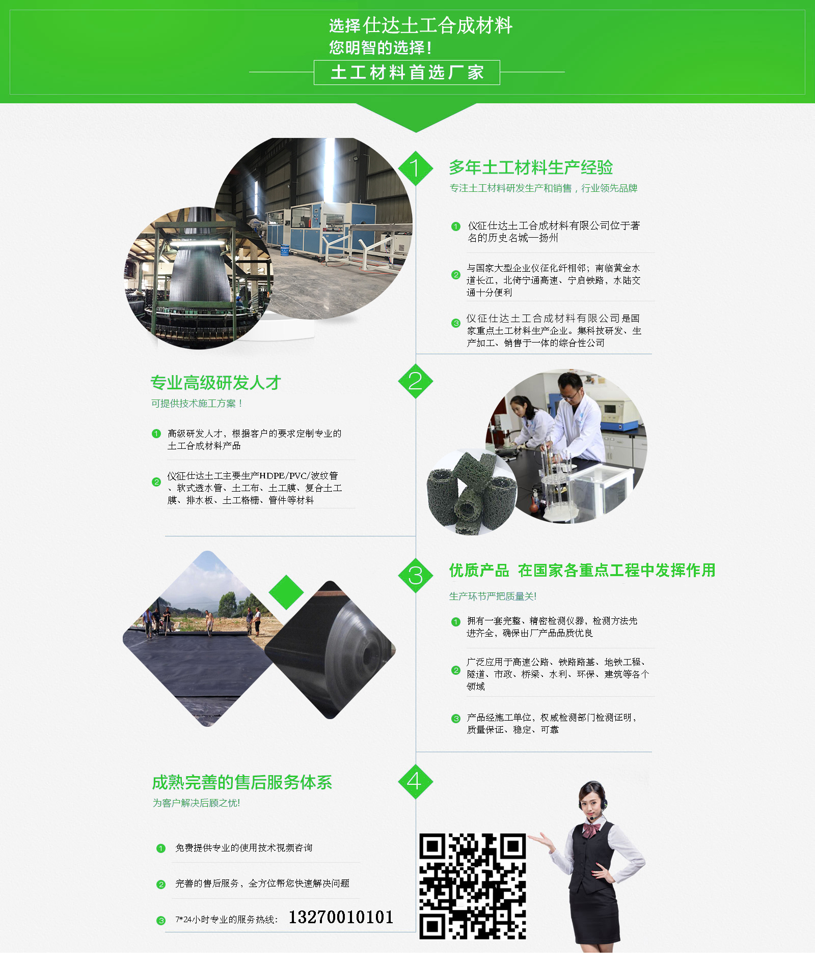 仪征仕达土工合成材料有限公司位于著名的历史名城—扬州,与国家大型企业仪征化纤相邻;南临黄金水道长江,北倚宁通高速、宁启铁路,水陆交通十分便利。目前土工材料已广泛应用于高速公路、铁路路基、地铁工程、隧道、市政、桥梁、水利、环保、建筑等各个领域,在国家各重点工程中发挥着重要作用。仕达土工以生产HDPE/PVC/波纹管、软式透水管、滤管(打孔包布管)、塑料盲沟、渗排水网垫、排水管、热熔垫片、防水板材、PE螺旋管、土工布、土工膜、复合土工膜、排水板、土工格栅、管件等材料,我们各生产线均采用目前国内先进的设备........